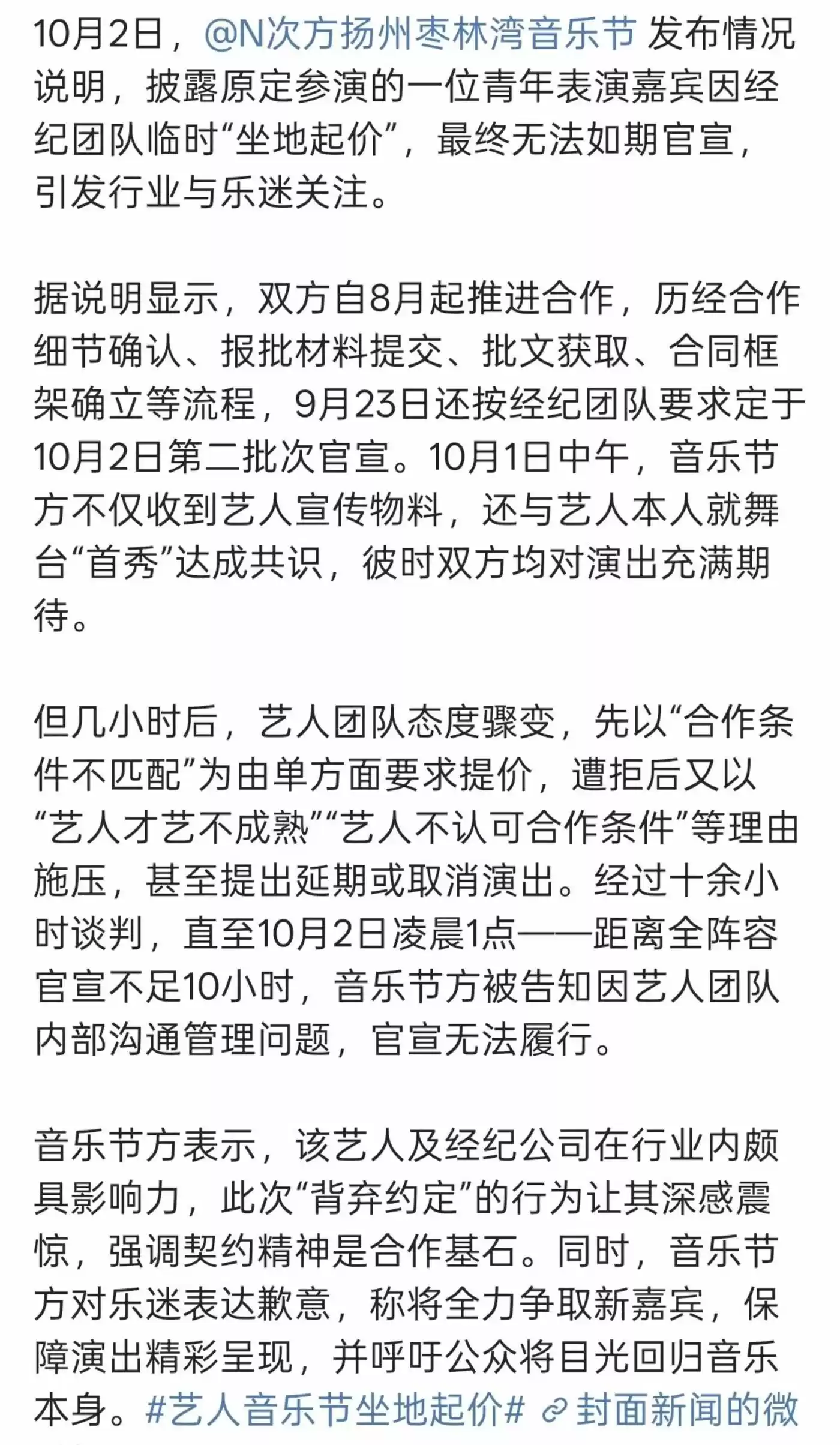 比如10月2日,高位热搜“艺人音乐节坐地起价”事件便是如此。据N次方扬州枣林音乐节发布的声明显示,某青年表演嘉宾团队在首秀演出推进约两个月后,以“合作条件不匹配”为由要求提升合作价格,在被拒绝后又以多理由称如若主办不同意,便只能延期或取消演出。
