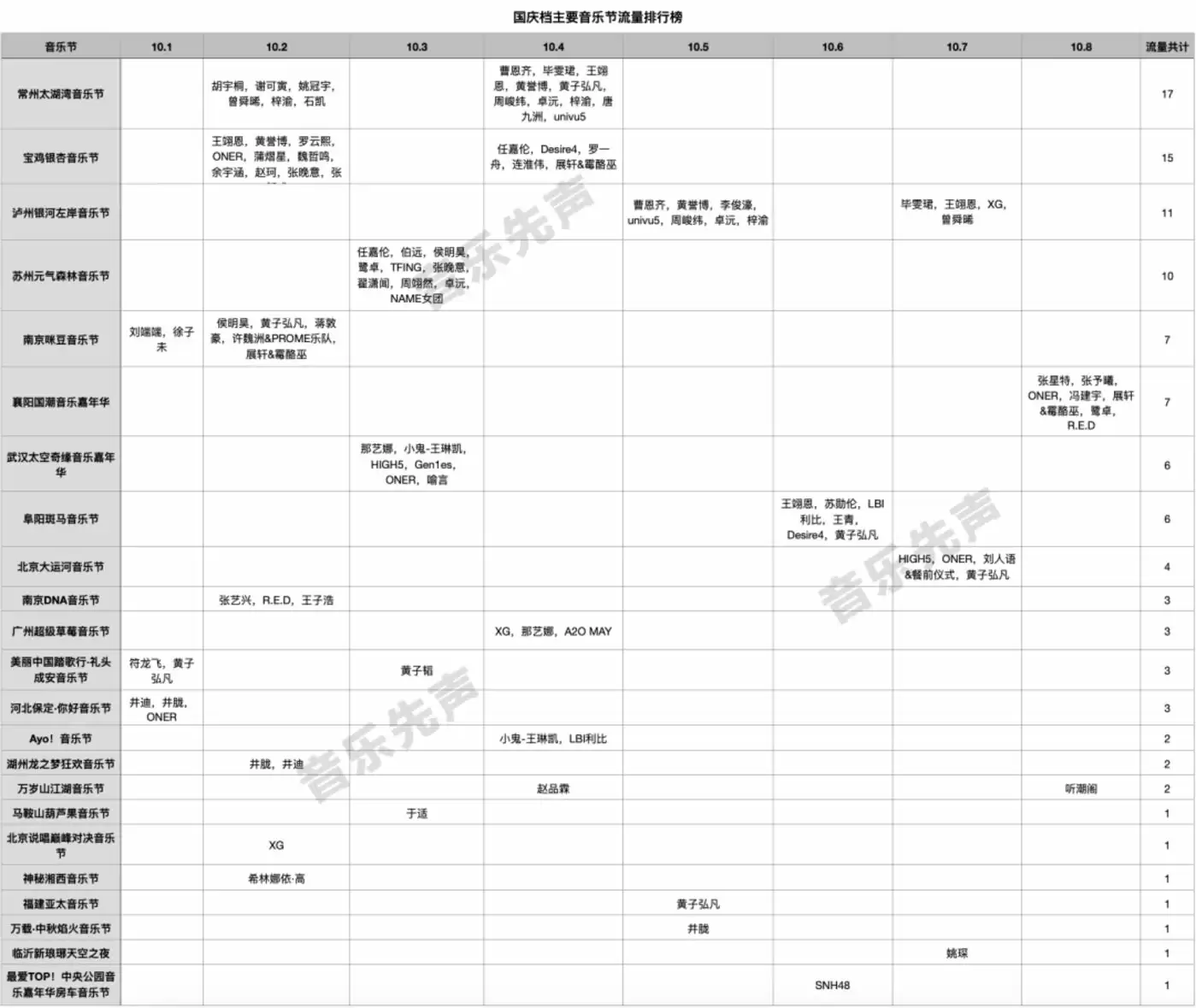 值得关注的是,除了劳模薛之谦与旗下艺人郭冠廷,以及新晋歌王陈楚生等外,黄子弘凡、ONER、井胧、王翊恩、黄誉博、展轩、卓沅、梓渝则是国庆档音乐节行程最密集的前十位流量艺人。