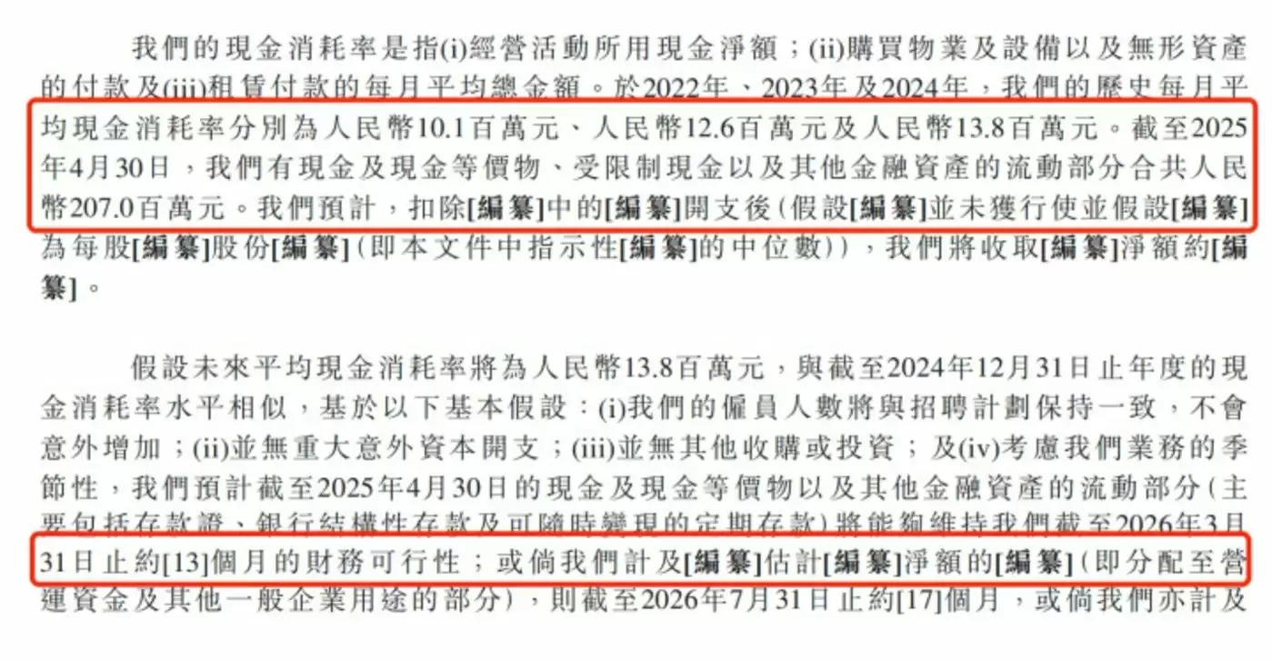 截至2025年4月30日,五一视界持有的现金及现金等价物、受限制现金,叠加其他金融资产的流动部分,合计约2.07亿元。若公司未来每月平均现金消耗率维持在1380万元水平,现有资金储备预计可支撑五一视界约13个月的运营,财务可行性可覆盖至2026年3月31日。
