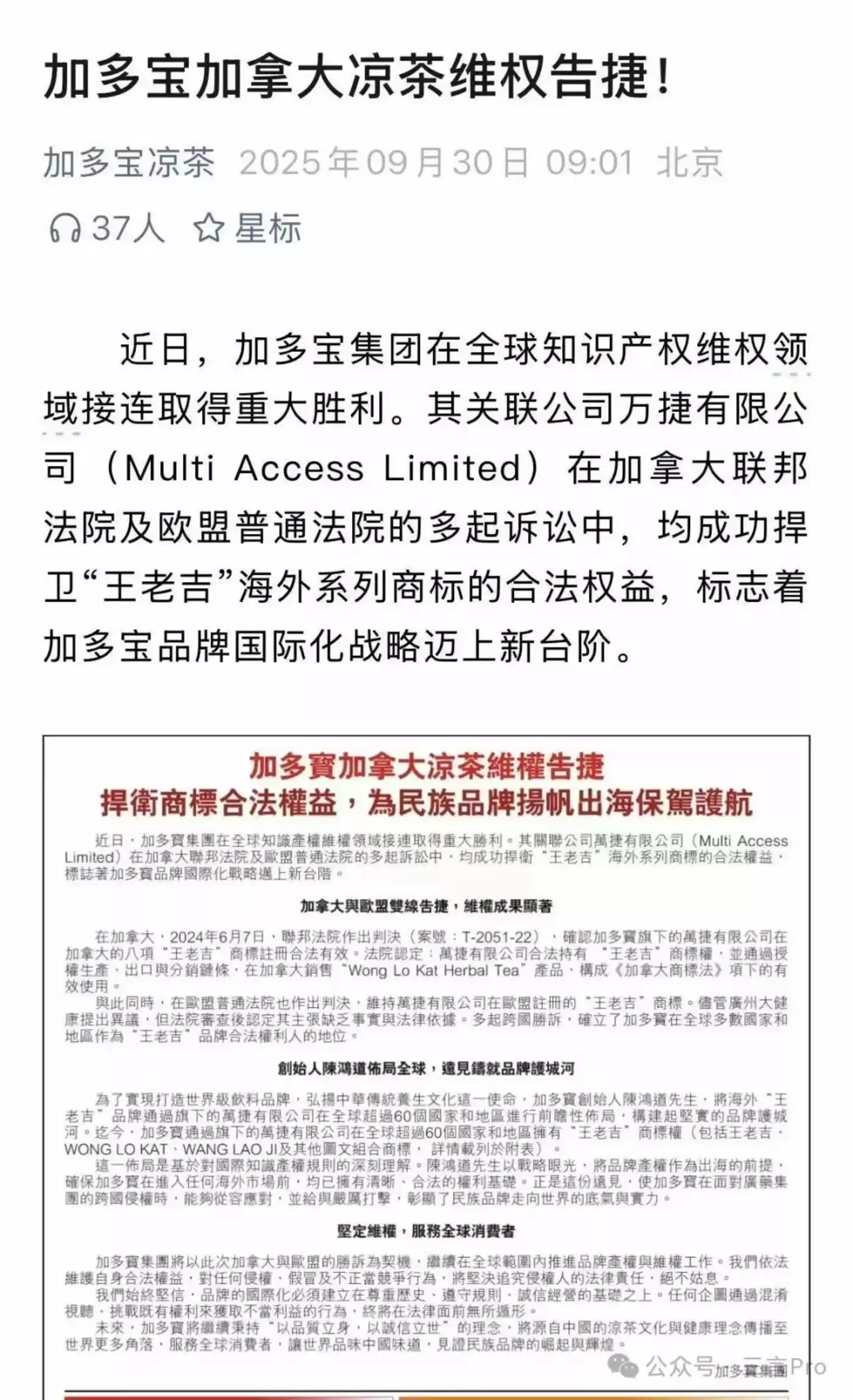 9月30日,加多宝最新发文称在海外多起诉讼中,取得了“王老吉”海外系列商标的诉讼胜利,当然另一方就是王老吉。