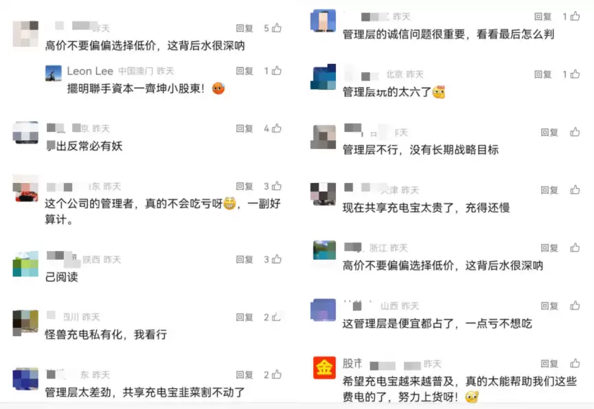 “摆明联手资本一起坑小股东。”有网友直言。与此同时,怪兽充电管理层的管理能力及其诚信问题,也引发广泛质疑。有充电宝行业人士在与《BUG》栏目沟通中直言:“或许他们高管和低价私有化机构商量好的利益分配方案对管理层是更优的,也才有此决策。”