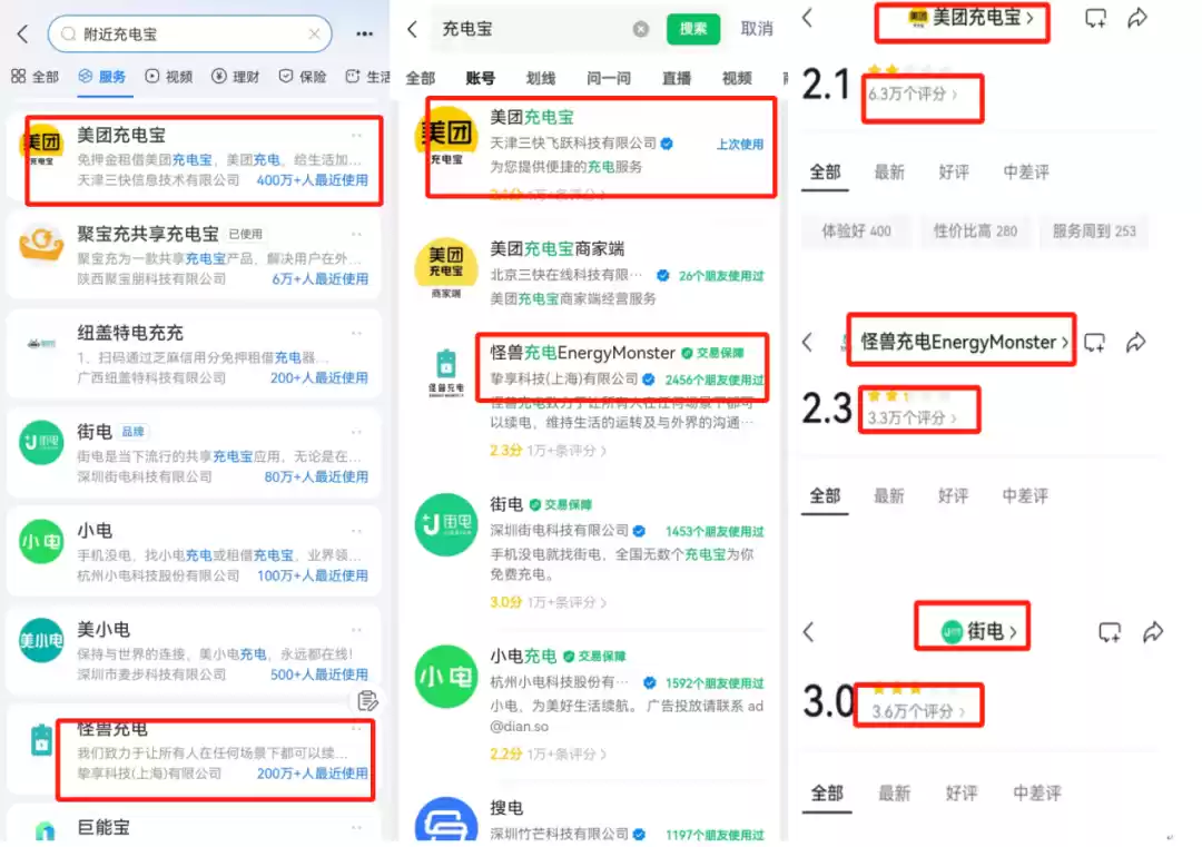 以支付宝“最近使用量”为例,美团充电宝最近使用人次超400万+,而怪兽充电最近使用人次为200万+,约为美团充电宝的一半。从微信小程序使用评论量来看,参与美团充电宝使用评论的用户,也数倍于怪兽充电。