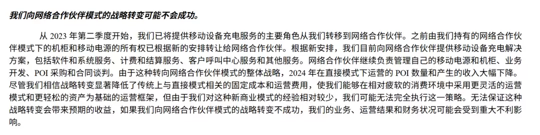 怪兽充电坦言:“公司过去曾出现净亏损,未来可能无法实现或维持盈利能力。”其还进一步指出,“公司向网络合作伙伴模式(即全面转代理加盟模式)的战略转变可能不会成功”。