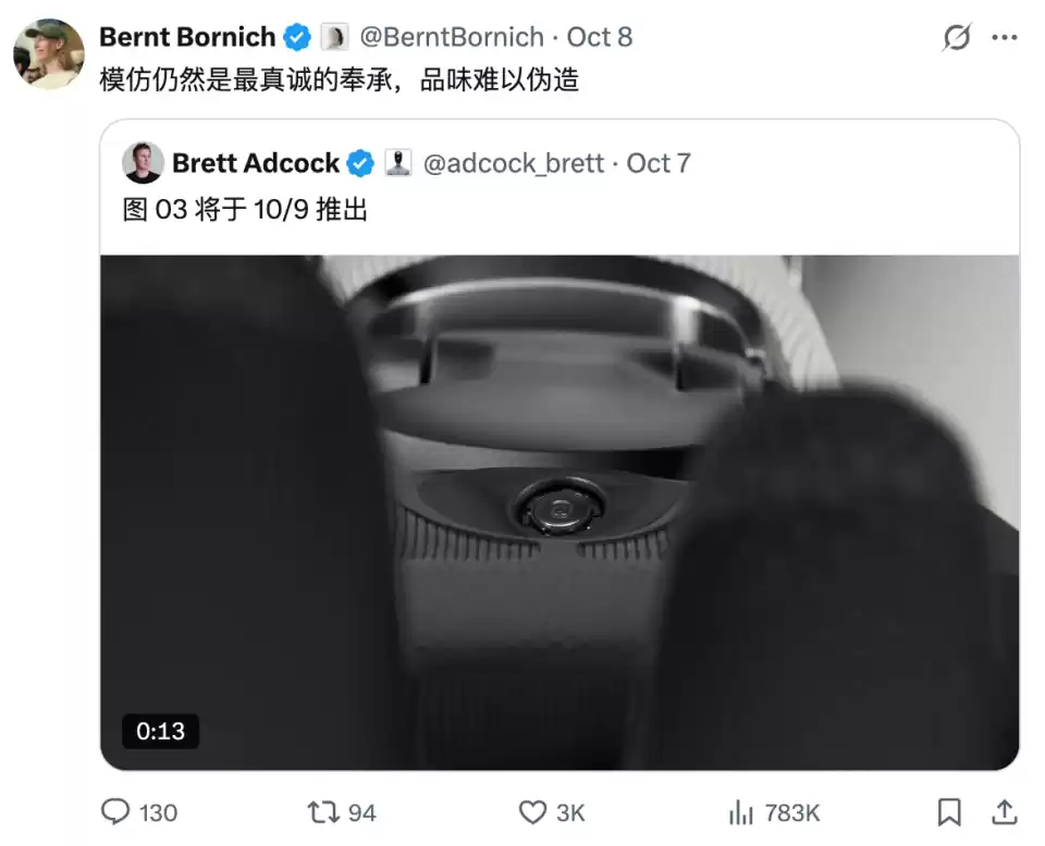 Figure 03发布后,1X Technologies创始人Bernt Bornich在社交媒体上暗戳戳地阴阳起来:“模仿仍是最真诚的赞美,品味却难以复制。”