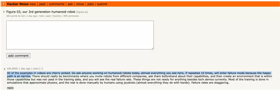 除此之外,在创业孵化器Y Combinator运营的科技社区Hacker News上,一些活跃在人形机器人岗位的从业者发表的评论也非常直接: