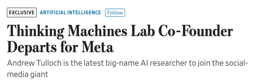 WSJ独家爆料称,Thinking Machines证实——联合创始人之一、明星AI研究员Andrew Tulloch离职加盟Meta。