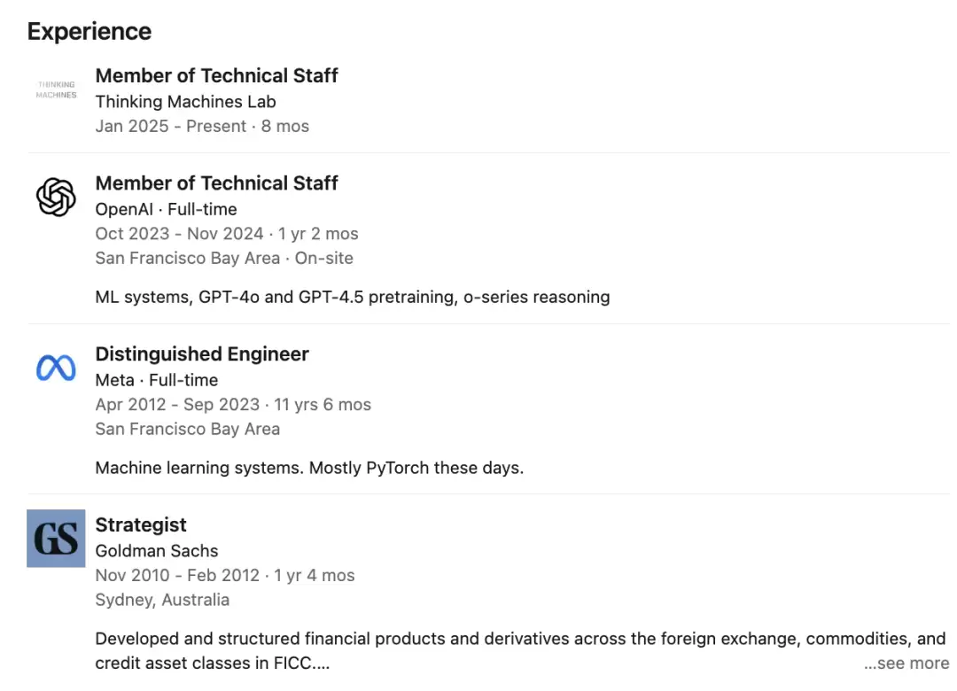 在此之前,他曾在Meta干了11年;随后2024年加入OpenAI,重点参与了GPT-4o、GPT-4.5预训练,o系列推理的研发。