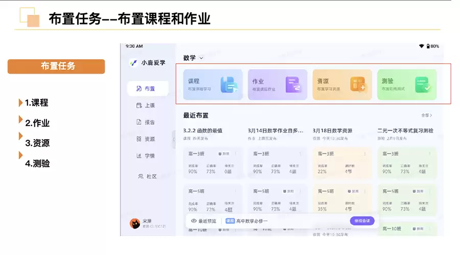 银河智学工作人员透露给「蓝洞商业」的小鹿爱学教师端可以看到,这套系统主要实现课程、作业、资源和测验等功能,老师后台可以看到所有学生的实时学习状态,包括学分、学习内容、进度和答题正确率等,在作业布置完成后,学生的客观题可自动批改,数据汇集之后可以形成精准的学生个人学情报告。