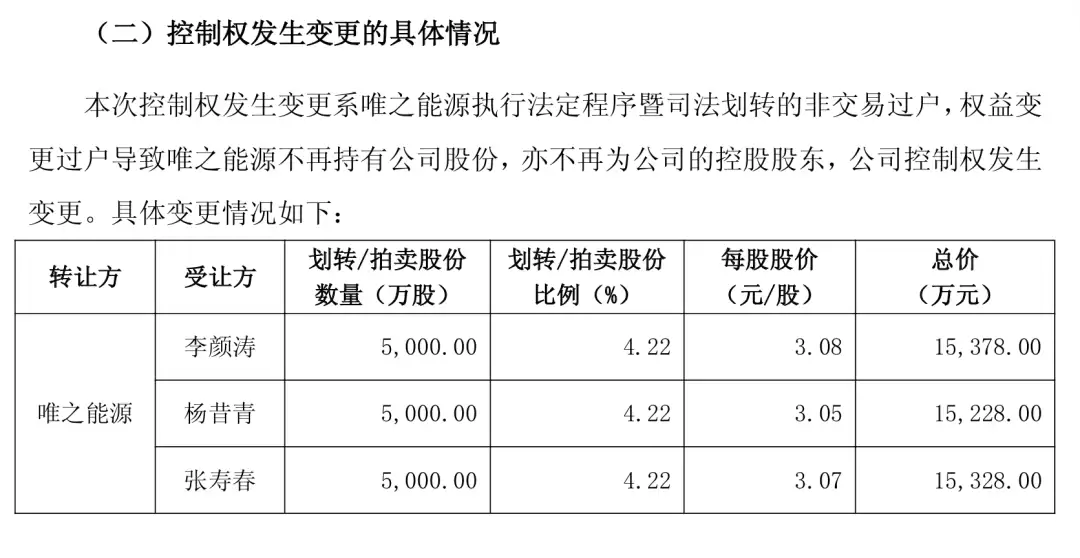 具体变更情况是,唯之能源作为转让方,受让方李颜涛、杨昔青、张寿春分别拍得5000万股,拍得股份占比为4.22%,每股股价分别为3.08元/股、3.05元/股、3.07元/股,总价均在约1.5亿元左右。