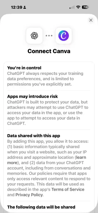 反观ChatGPT,使用其应用功能前,用户得先安装对应应用,然后通过充满警告的权限屏幕将其连接到ChatGPT,再通过多步验证完成绑定,整个过程并不轻松。