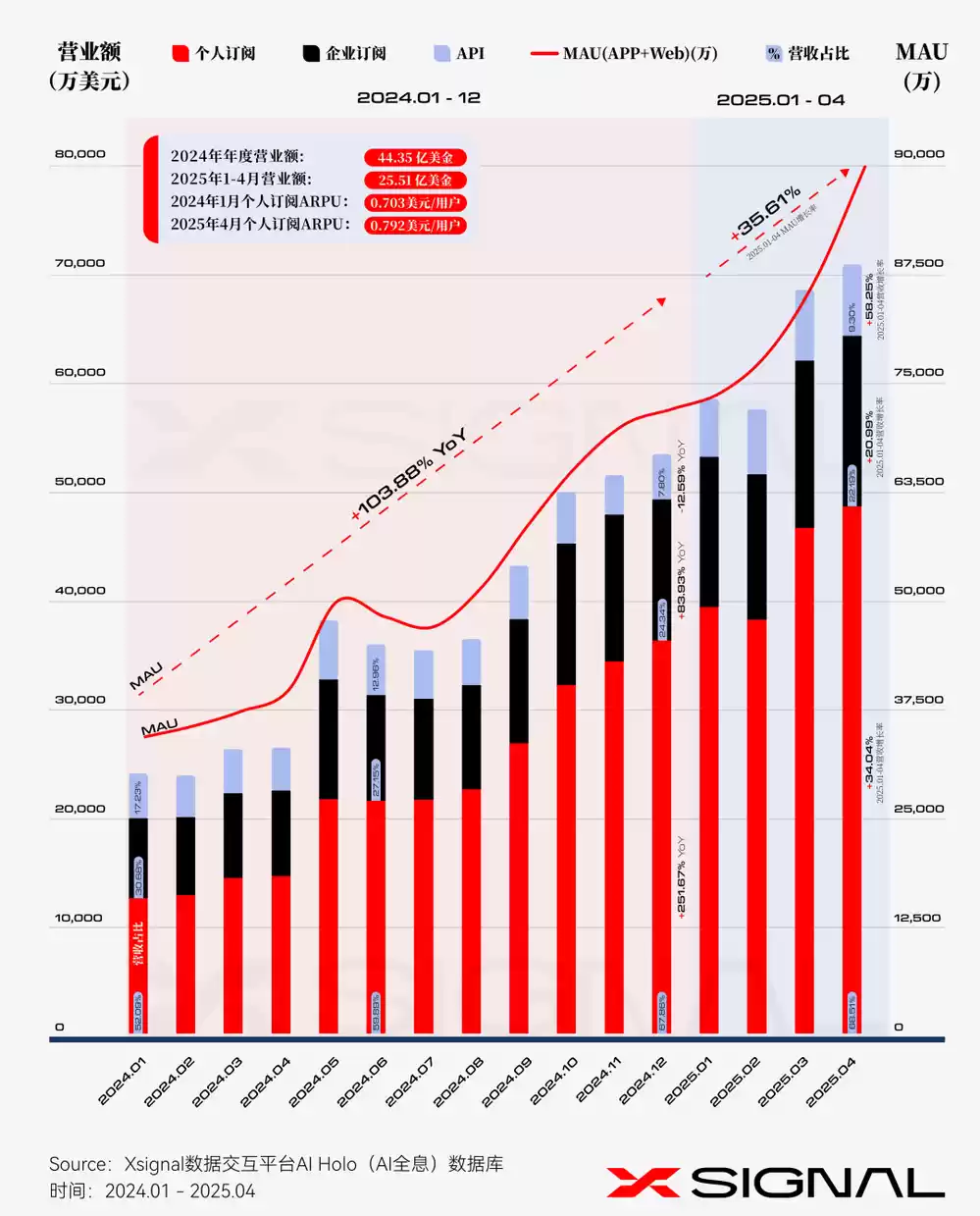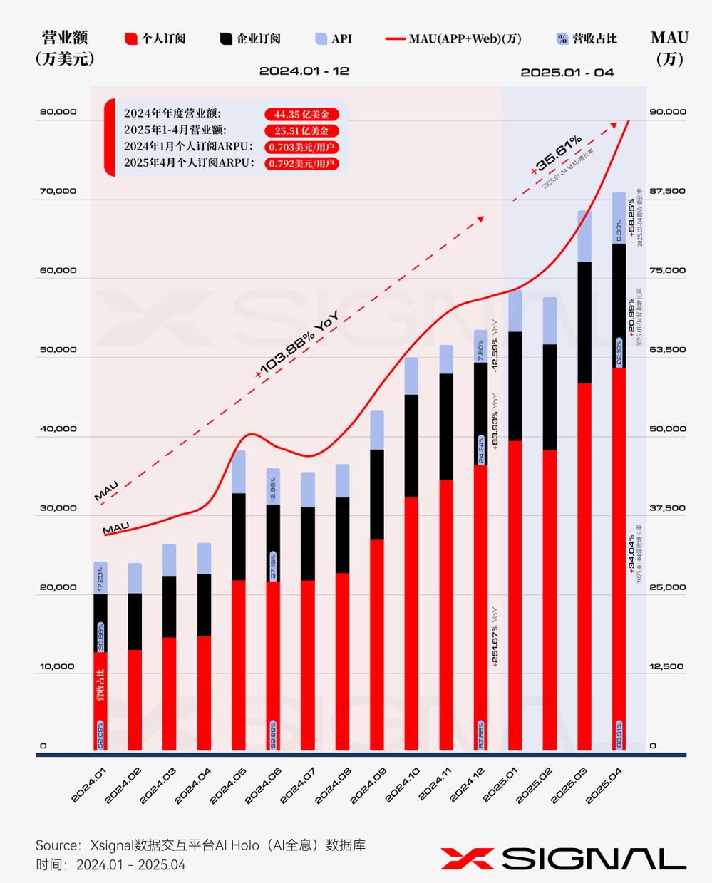 梳理过往ChatGPT的用户量增长情况来看,Xsignal AI Holo(AI全息)数据库数据显示,自2024年11月发布到2024年12月,ChatGPT的MAU突破2亿,在2024年度,MAU继续从3.2亿激增至6.5亿,年度增长率高达103.88%,在今年第一季度,ChatGPT实现了35.61%的显著增长,MAU接近9亿。