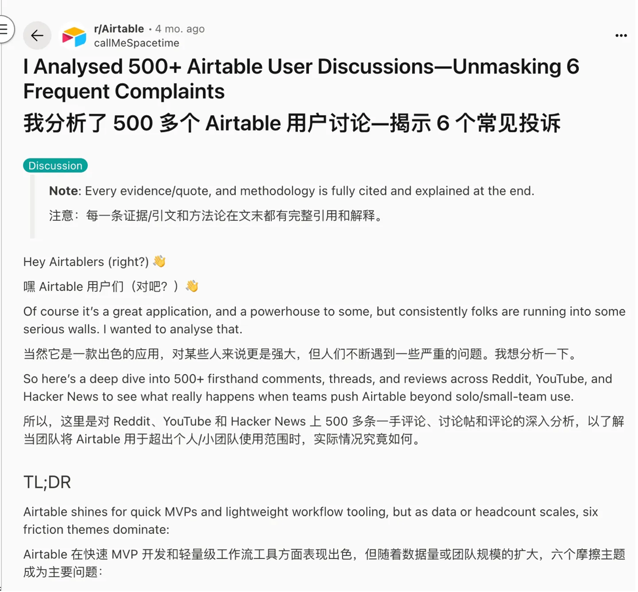 然而,在Reddit等社区中,大量Airtable的长期“超级用户”表达了截然不同的看法。他们的批评主要集中在以下几个方面: