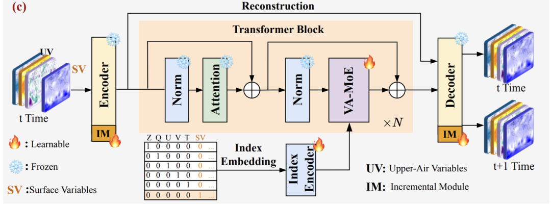VA-MoE 的核心运行逻辑围绕「两阶段训练范式」展开,如下图所示,其完全模拟实际观测中「数据逐步扩充」的场景:第一阶段为「初始阶段」,仅使用高空变量训练模型,让模型先掌握大气高层的核心动力学规律;第二阶段为「增量阶段」,在冻结第一阶段已训练参数的前提下,加入地面变量,仅训练为新变量新增的模块,最终形成完整模型。