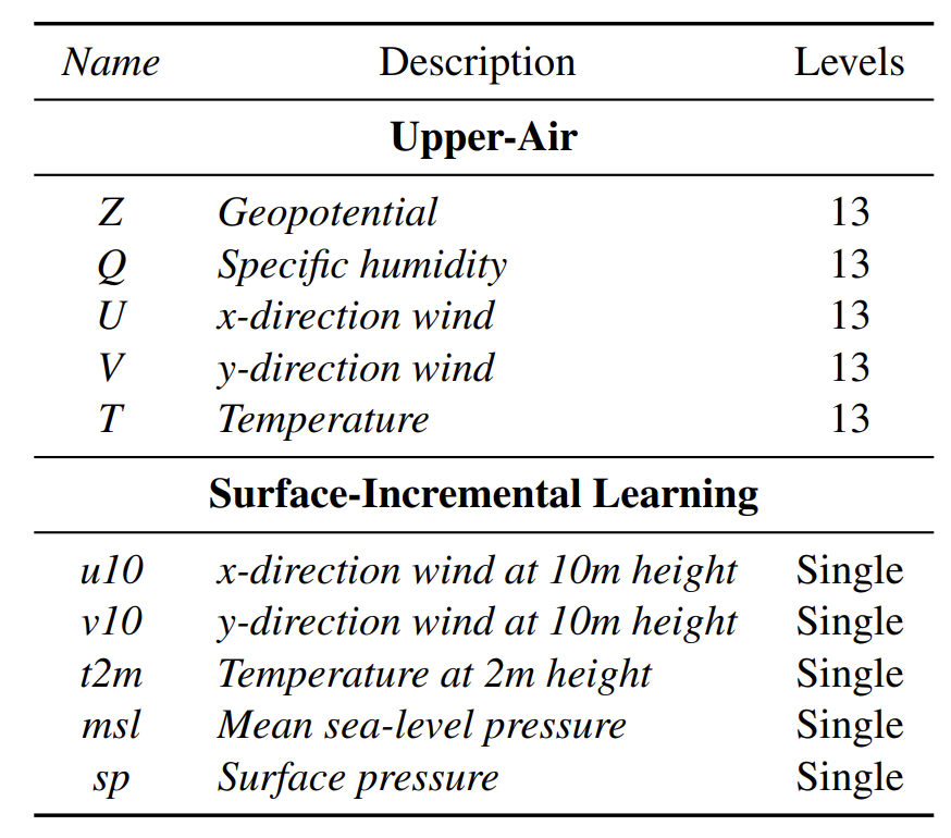 *地面变量:含 2 米气温 T2M、10 米东风速 U10、10 米南风速 V10、平均海平面气压 MSL、地面气压 SP 等,作为增量变量,在模型第二阶段(增量训练阶段)引入,模拟实际观测中变量动态扩充的场景。