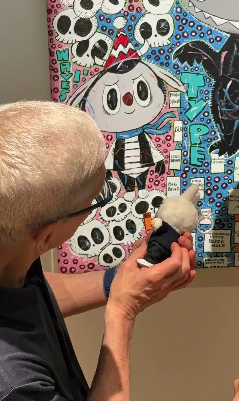 龙家升赠送给库克一个特殊的 Labubu 玩偶,该玩偶穿黑衣服、白鞋子、戴眼镜,有点像设计师龙家升的造型,左手还拿着一个橙色的 iPhone 17 Pro 手机。