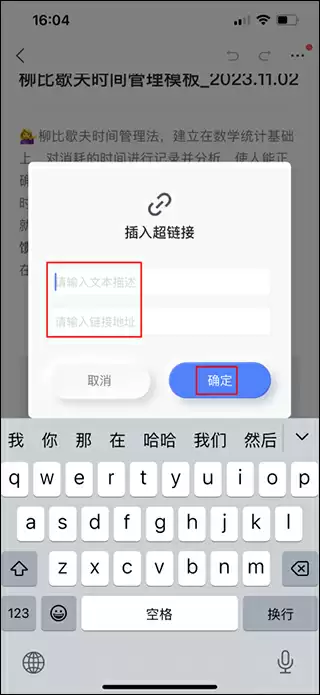4、在弹出的对话框中,分别输入链接文字说明和目标网址,确认无误后点击"确定"即可完成链接插入。
