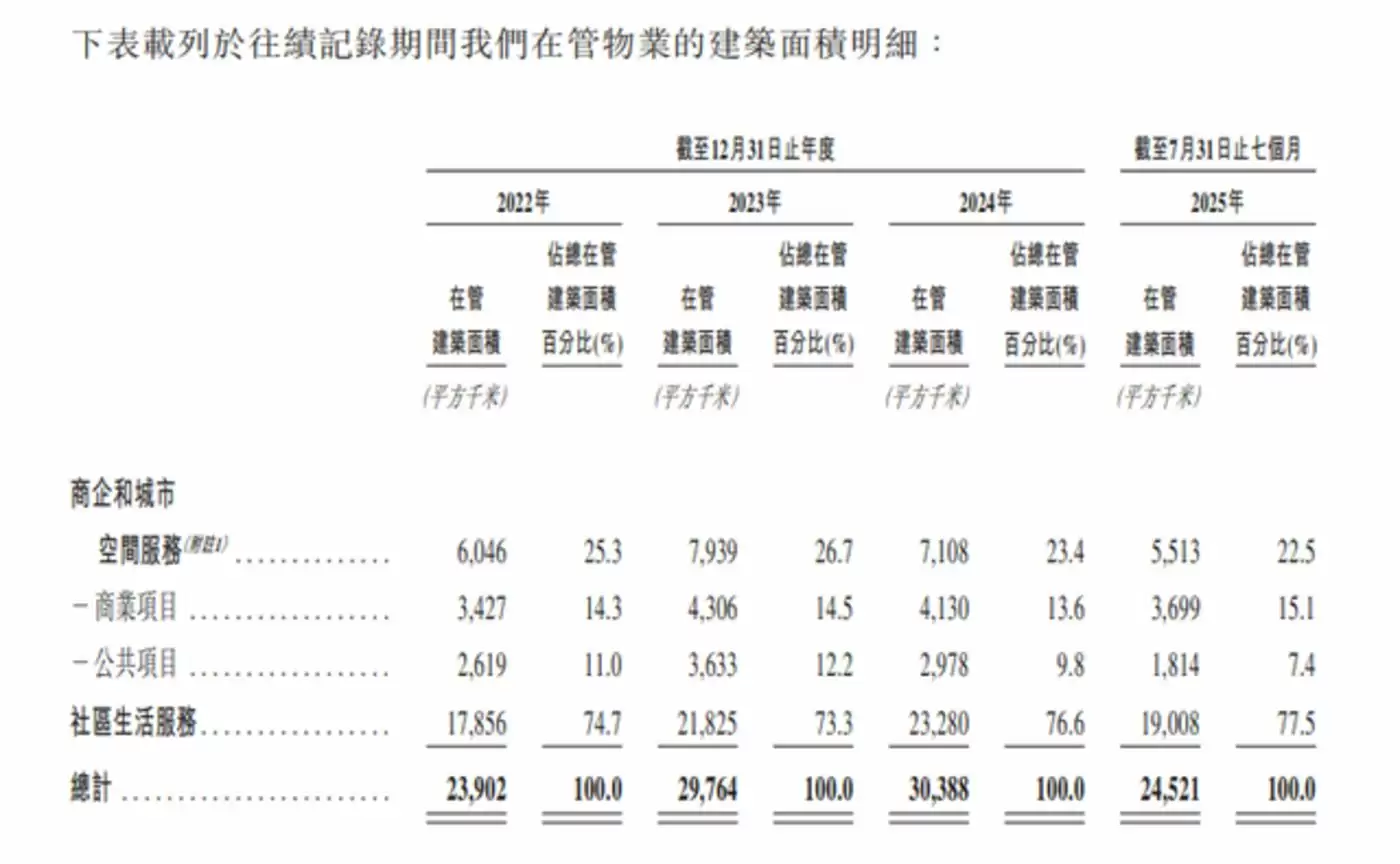 一系列“买买买”之后,2025年7月,奥联服务共有269个在管项目,在管面积为2452.1万㎡,其中社区生活服务占比为77.5%。这个体量,放在物业管理上市公司中,仍是“蚊型”公司。