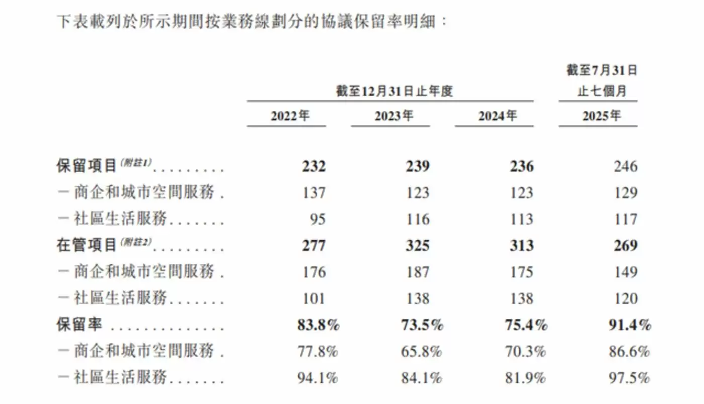 在物业管理行业集体向精细化运营的趋势下,奥联服务的低价策略或许很难提供优质服务,其在管项目保留率从2024年的83.8%跌至2024年的75.4%,2025年7月反弹到91.4%。