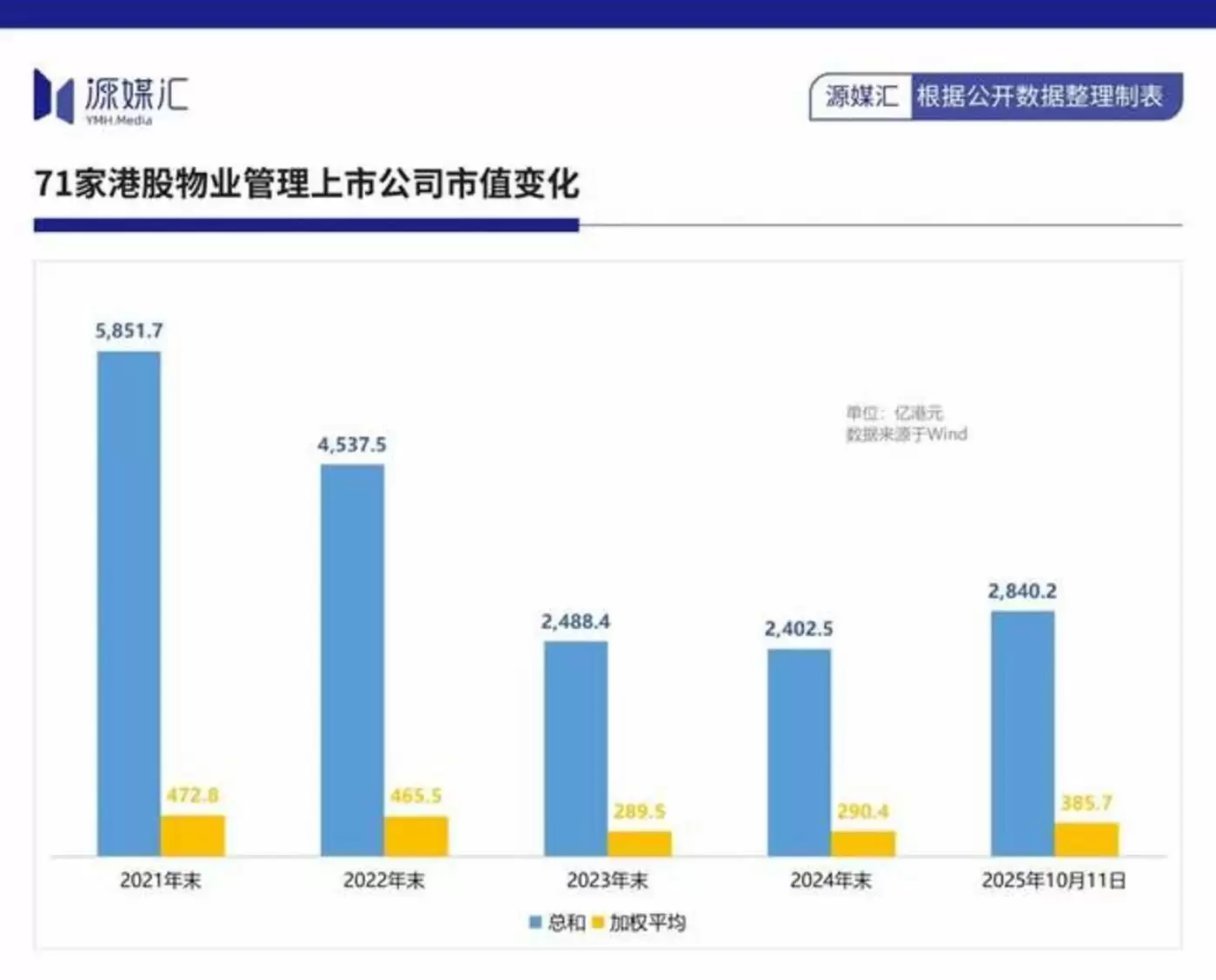 根据Wind数据显示,过去4年时间里,71家港交所物业管理上市公司市值快速下降,总市值从2024年的5851.7亿港元下降到2025年10月的2840.2亿港元,加权平均值则从472.8亿港元下降到385.7亿港元。