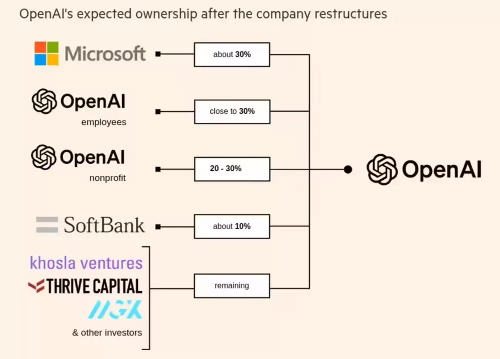 对于 OpenAI 来说,实现公司愿景的关键在于与其最大投资方微软进行的谈判,内容涉及将公司转变为更传统的营利性企业结构。转为营利性结构是企业上市前的必要步骤,这也是投资方最有可能获得丰厚回报的途径。