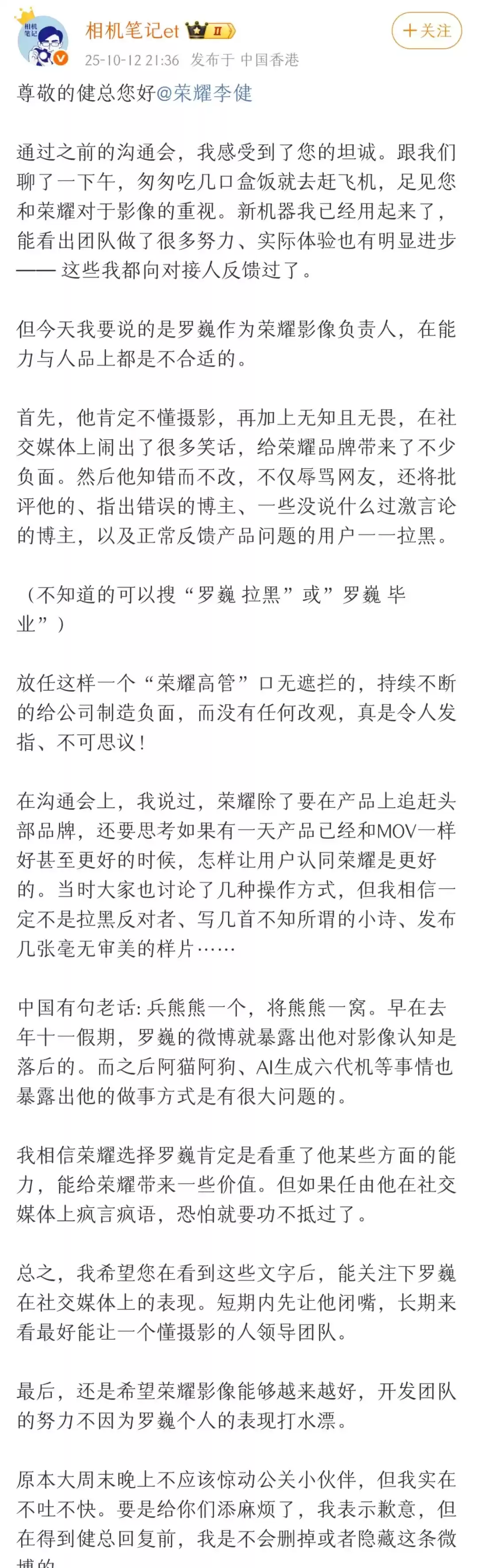 荣耀影像工程师罗巍删除摄影博主,样片争议持续发酵