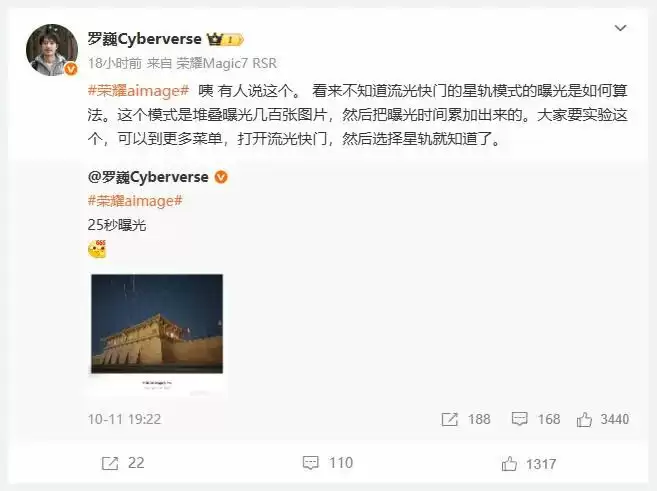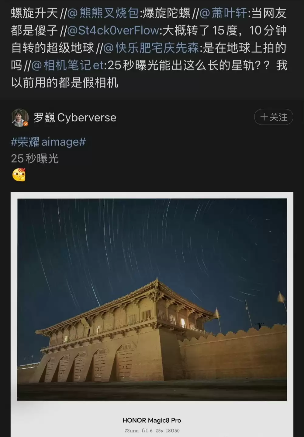 10月14日消息,10月11日,荣耀首席影像工程师罗巍在社交媒体晒出荣耀手机拍摄样片,并备注25秒曝光。