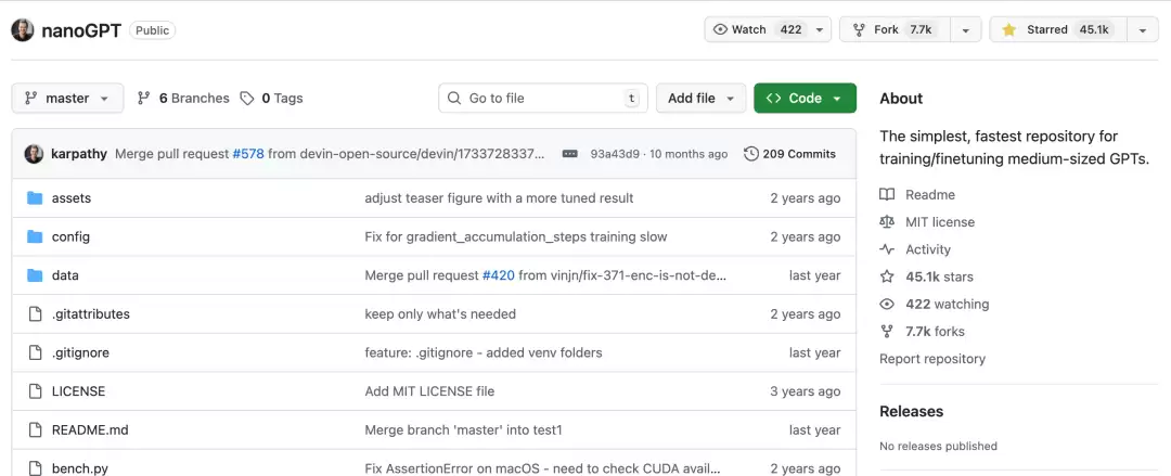 Karpathy说他的目标是把完整的「强基线」栈整合到一个连贯、极简、可读、可修改、可最大化派生的仓库中。