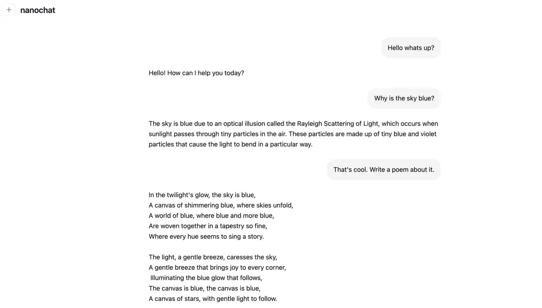 整个系统仅约8000行干净代码,启动一台GPU机器、运行一条脚本,4小时后你就能在网页界面与自己训练的「小ChatGPT」对话。