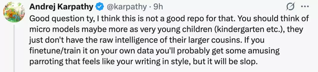 Karpathy 认为,应该把这个微型模型更多地看作是非常年幼的孩子,并没有那么强大的原始智能。如果你在自己的数据上微调 / 训练它,你可能会得到一些有趣的鹦鹉学舌效果,感觉像是你在风格上写作,但它会一团糟。
