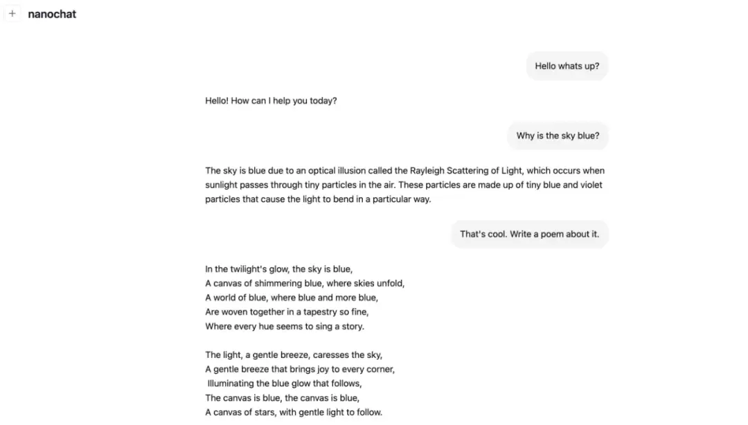 使用 WebUI 与价值 100 美元、耗时 4 小时的 nanoc h a t 进行的示例对话。