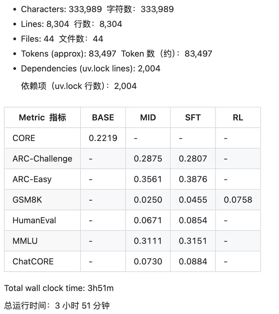 下图是 Karpathy 这次 100 美元快速训练(speedrun)示例在报告中产出的一些指标摘要。