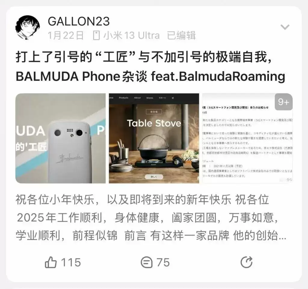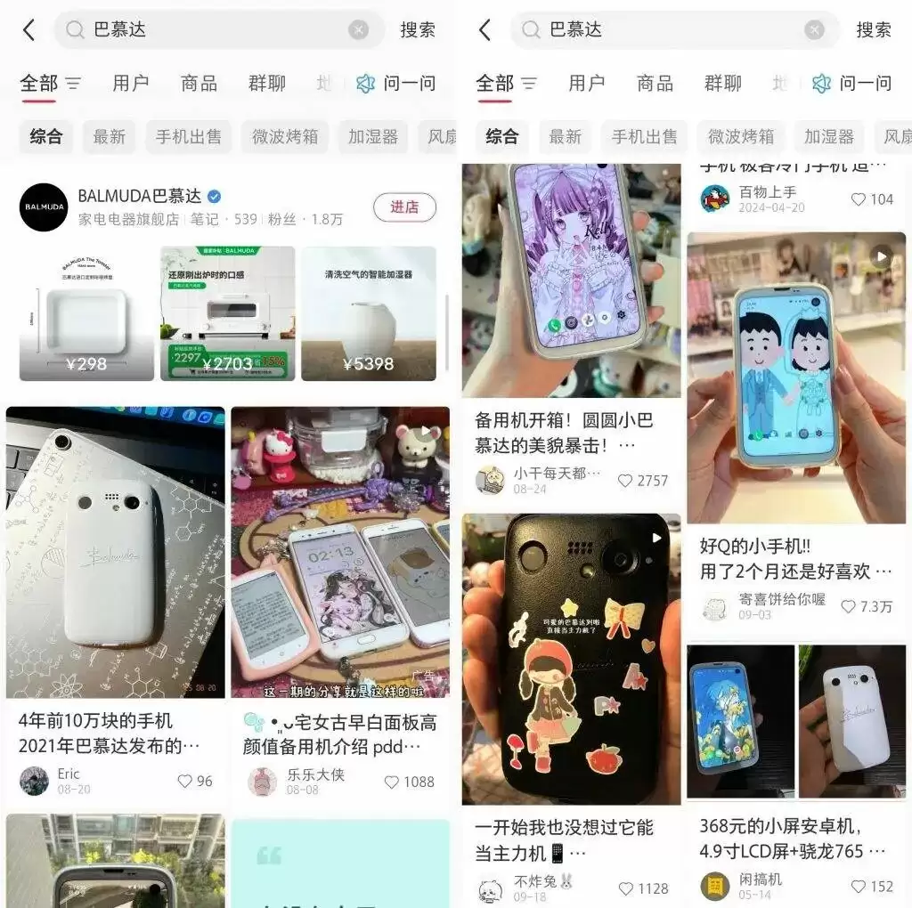 现在上小红书搜索「巴慕达」三个字,会出现品牌最新账号,焦点产品也还是各种家电。但匪夷所思的是,往下一划,一篇篇巴慕达手机「BALMUDA Phone」的帖子琳琅满目,几乎看不到任何关于家电产品的讨论。