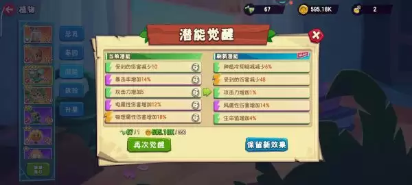 2、进入潜能界面后,点击右下角的"潜能觉醒"按钮,系统会随机刷新植物的潜能属性。这些属性分为不同品质(通过颜色区分),玩家可以根据刷新出的属性数值决定是否保留。每次潜能觉醒都需要消耗"潜能药剂"和游戏金币,如果想锁定某个属性不被刷新,还需要使用"潜能锁定剂";