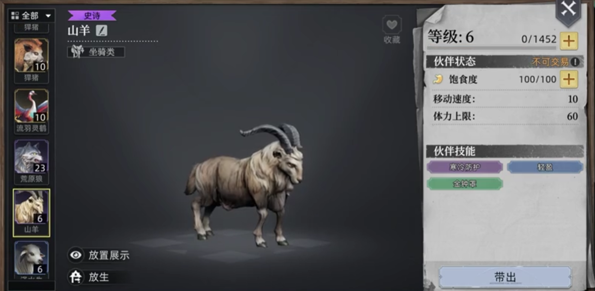 此外,山羊在资源获取方面表现优异,特别擅长帮助玩家加速开采石料。作为建筑和工具制作的重要材料,石头的需求量一直很大,因此山羊的实用性很高。不过需要注意的是,捕捉山羊需要前往雪山地区,除了要应对严寒天气,还需用篝火融化冰封山羊的冰块。雪原周围潜伏着许多危险生物,建议组队前往更为稳妥。