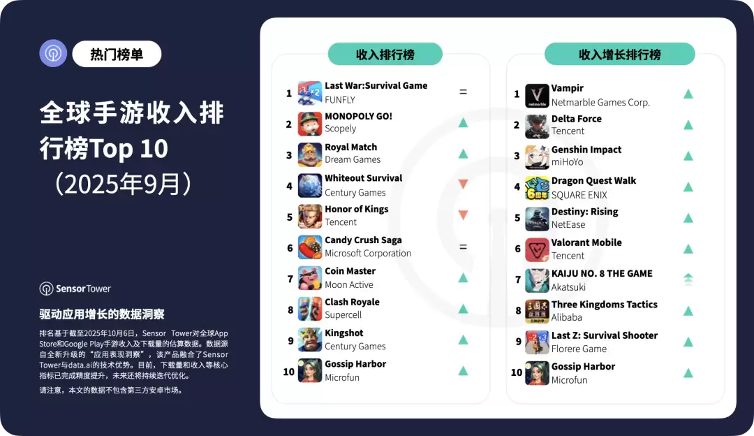 10月14日消息,根据 Sensor Tower 的“应用表现洞察”数据,FUNFLY旗下的《Last War: Survival Game》持续位居全球手游收入榜首。《MONOPOLY GO!》和