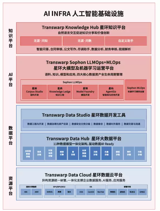 星环科技新一代AI基础设施采用分层架构设计,自下而上形成完整的技术闭环,包含四大核心组成部分: