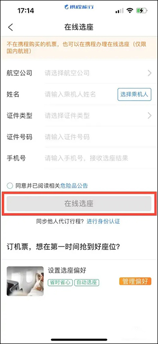 4、跳转至在线选座页面后,依次填写航班与乘机人信息,勾选同意服务协议,最后确认“在线选座”即可完成值机与座位选择。