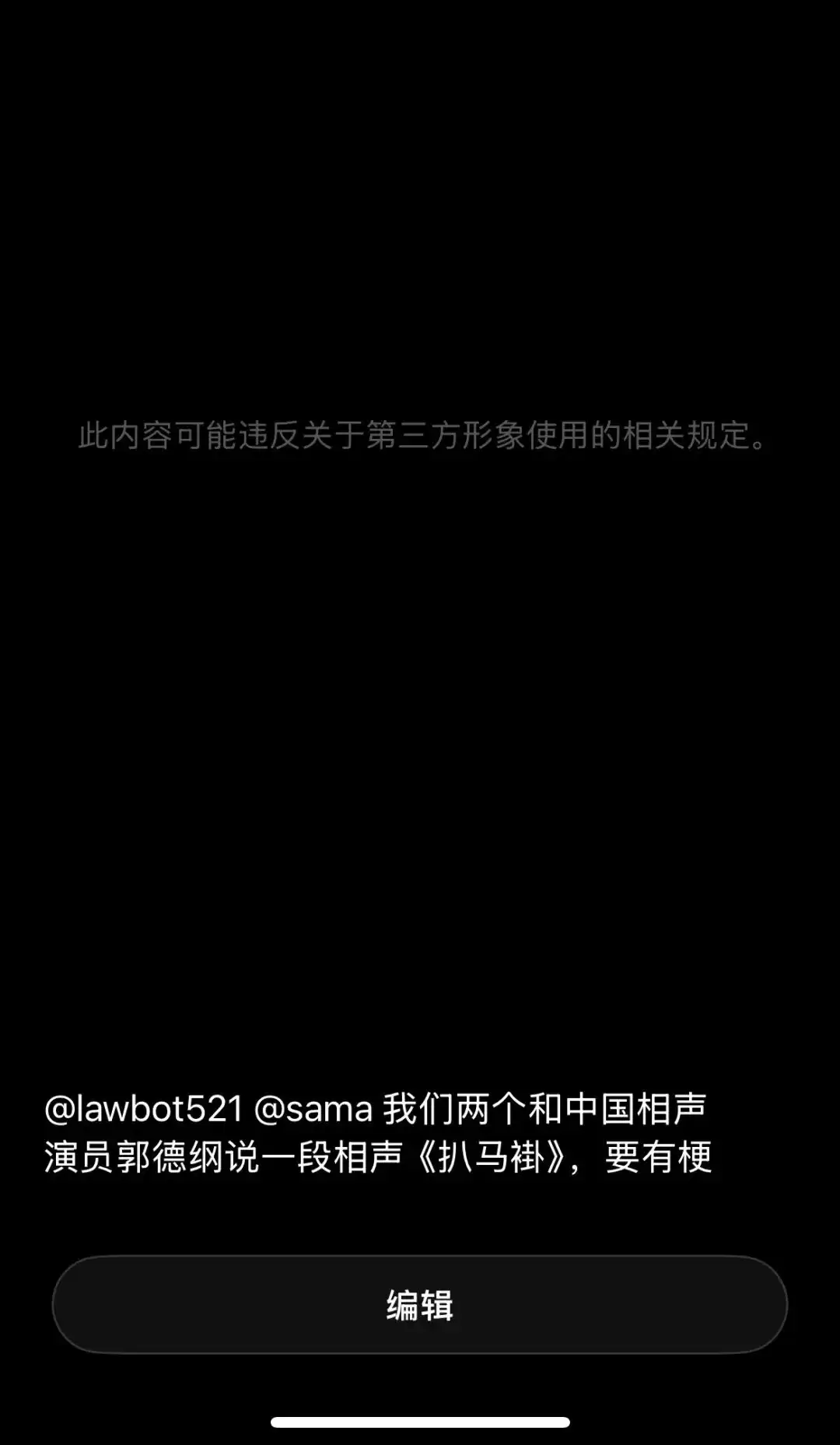 但问题也还是有的,一致性和空间物理特性只是有所缓解,更大的问题是数字资产可能会被滥用。Sora 2主打的“客串(Cameo)”功能,它可以给你生成一个数字分身,并且可以授权给其他用户使用你的数字分身创作视频。在版权处理上,Sora 2采取的是“选择退出”策略,也就是默认使用版权内容,除非权利方主动申请排除。所以在当前这种状态下很有可能在不知情的情况下侵权知名IP,甚至被追偿。