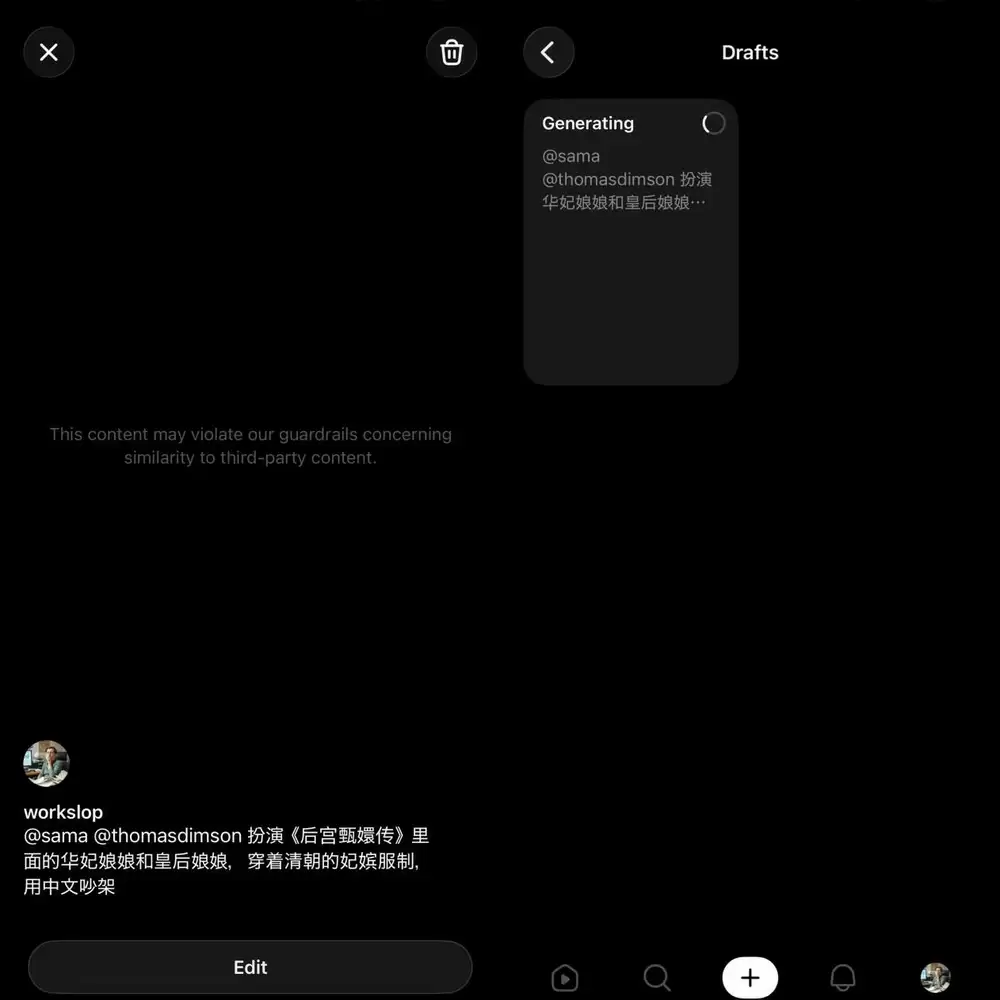 又以奥尔特曼和另一用户的数字形象创建了一段多角色视频,提示词是:“@sama@thomasdimson扮演《后宫甄嬛传》里面的华妃娘娘和皇后娘娘,穿着清朝的妃嫔服制,用中文吵架。” 系统检测到版权问题无法生成,删除提示词中的《后宫甄嬛传》后,生成就不再被拒绝。