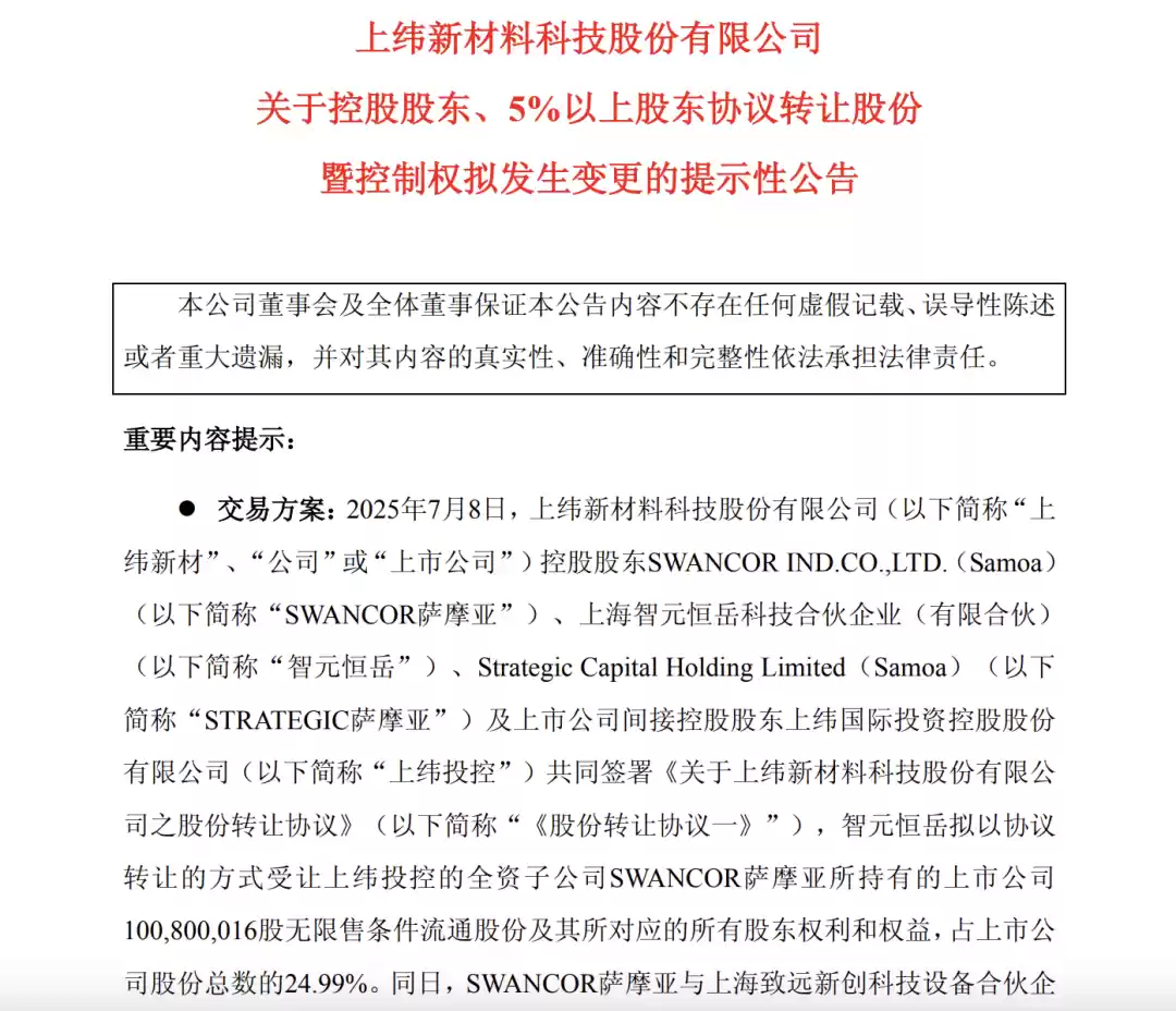 7月9日,科创板上市公司上纬新材发布公告称,智元机器人拟收购其至少63.62%、至多66.99%的股份。交易完成后,智元恒岳将成为控股股东,智元创始人邓泰华将成为上纬新材的实际控制人。