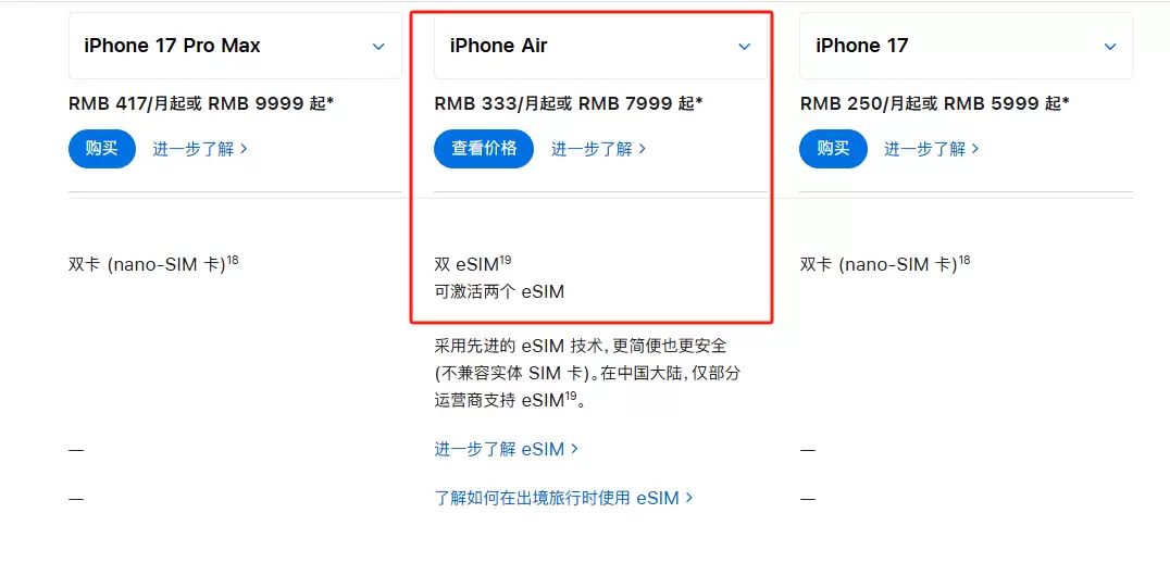 但在9月12日iPhone 17系列预售当天,iPhone Air缺席。同日苹果中国正式更新消息称:“中国移动、中国电信和中国联通将为本产品(iPhone Air)提供eSIM支持,具体时间依监管部门审批情况而定。”