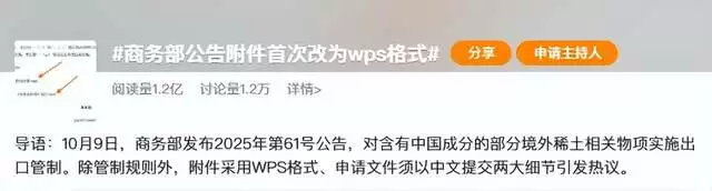 商务部10月9日发布2025年第61号公告,对含有中国成分的部分境外稀土相关物项实施出口管制。除管制规则外,附件采用WPS格式,要求相关申请文件须以中文提交两大细节引发热议。据悉,10月9日之前最新的两个公告,文件都是word或pdf格式。
