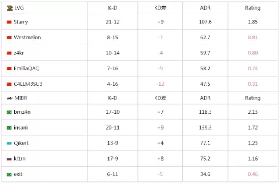 易边再战,LVG手枪局五人集结铁板进攻B区,成功占领无人防守的包点并埋下雷包。在5v5回防中,z4kr与Starry联手完成双人五杀,为队伍赢下手枪局。然而好景不长,次局MIBR强起局在A区布下天罗地网,用冲锋枪全歼进攻方完成经济重置。遭受重创的LVG经济崩溃,随后的强起与ECO局均告失利,MIBR顺势拿到赛点。