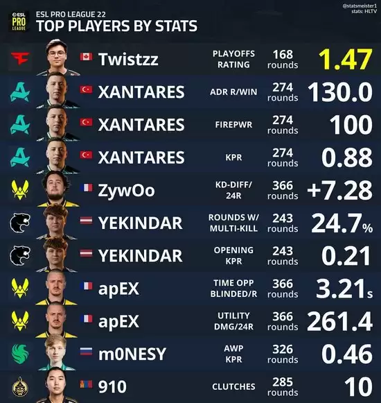 EPL S22数据盘点:XANTARES三项数据领跑全场