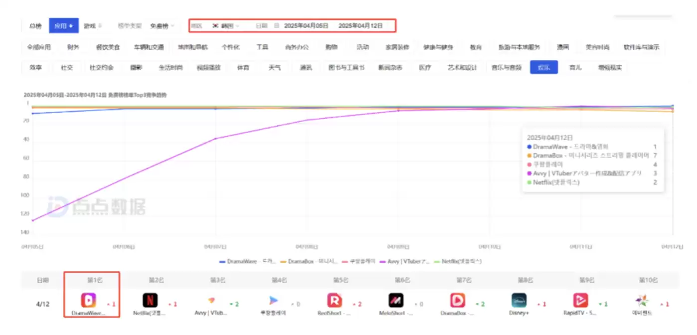 DramaWave 韩国 Google Play 娱乐应用榜排名情况