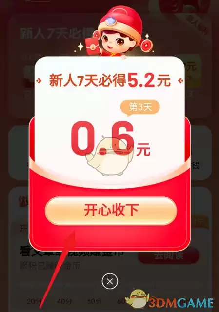 3、签到成功后,点击“开心收下”即可领取当日奖励,如图所示