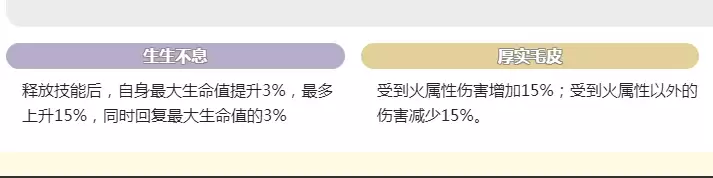 被动技能同样表现亮眼:“生生不息”在施放技能后可提升3%最大生命值,最高叠加至15%,显著增强续航能力;“厚实毛皮”需注意搭配使用,虽然会受到额外15%火属性伤害,但能减免其他所有属性15%伤害,只要避开火系敌人,生存能力将大幅提升;“亢奋”堪称团队核心增益,施技后全队获得50%伤害加成,需要注意的是该效果不可叠加。