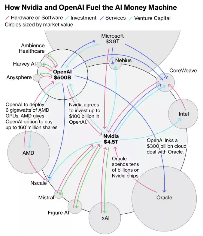 这场热闹非凡的硅谷联盟,以英伟达和OpenAI的合作热度最高。甲骨文、AMD、英特尔以及博通等与AI强相关的芯片或算力企业,也都乐于捧场。不过,微软、谷歌、Meta、苹果和亚马逊等其他科技巨头,总体上仍处于置身事外的观望状态。