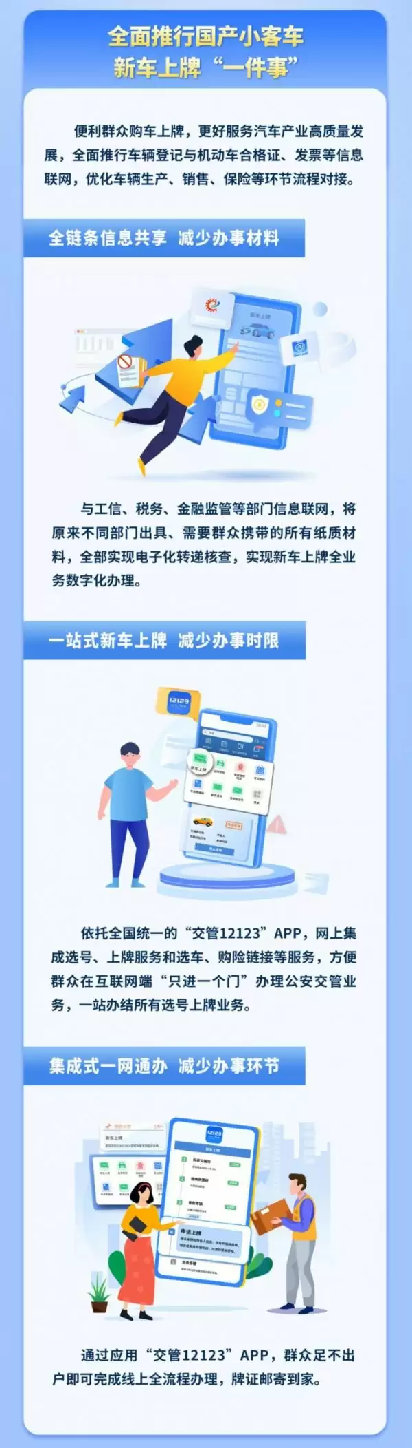 在新车上牌环节,车主通过"交管12123"APP的"新车上牌"模块即可完成选号等手续,公安交管部门将在线核验车辆合格证、保险、发票、购置税等证明材料。