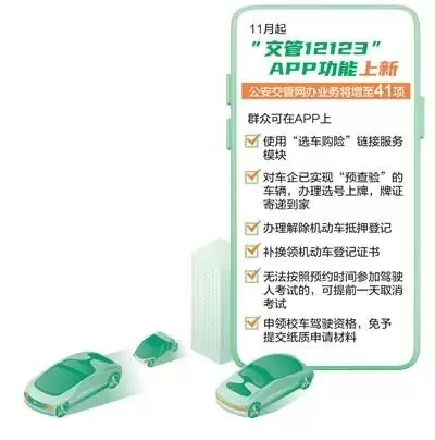 公安部交通管理局局长王强介绍,目前已有35项交管业务实现“交管12123”APP线上办理,包括补换领号牌、行驶证、驾驶证,考试预约及轻微交通事故视频快处等。新措施实施后,线上业务将增至41项,预计每年可为上亿群众提供便利,减少往返窗口的奔波。